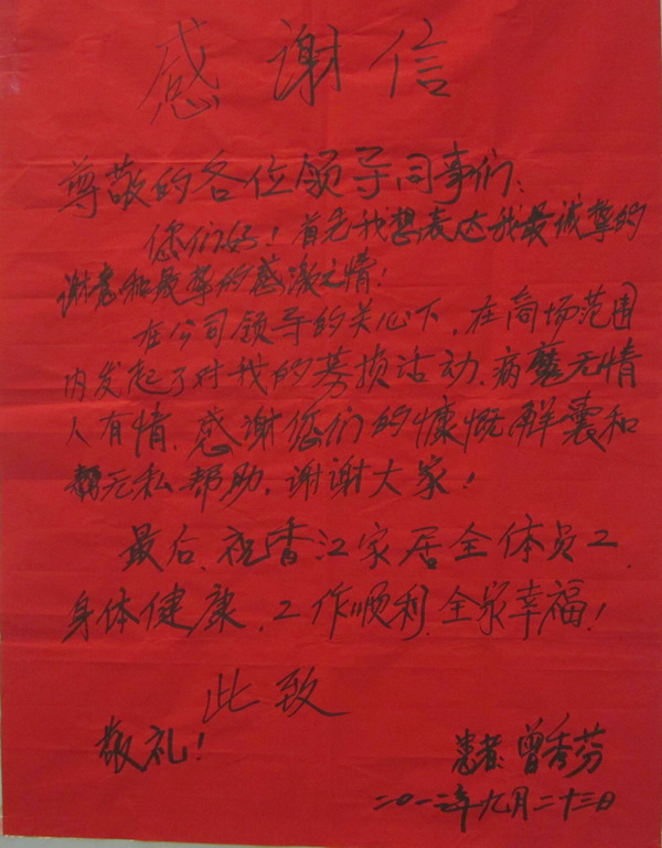 9月16日,惠州香江家居領(lǐng)導(dǎo)在得知此信息后,立即決定倡議全體公司員工進(jìn)行愛心捐款,幫助這個(gè)處于困難之中的家庭。9月18日早上9點(diǎn),愛心捐款正式開始,各部門員工及商戶老板、導(dǎo)購員紛紛踴躍捐款,店總楊太山率先垂范,個(gè)人捐款1000元。截止9月19日下午,公司共收到捐款24645元。這些捐款在20日送到了曾秀芬家人手中。香江集團(tuán)“愛、誠、信”的企業(yè)價(jià)值觀和“溫馨家園”的企業(yè)氛圍又一次得到體現(xiàn)。相信曾秀芬定能在大家的幫助下戰(zhàn)勝病魔,也祝愿每一位奉獻(xiàn)愛心的員工能好人一生平安。