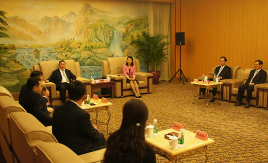 市委書(shū)記徐萍華(右起第三)、市長(zhǎng)郭鋒(右起第二)與劉志強(qiáng)(右起第四)會(huì)見(jiàn)投資客商