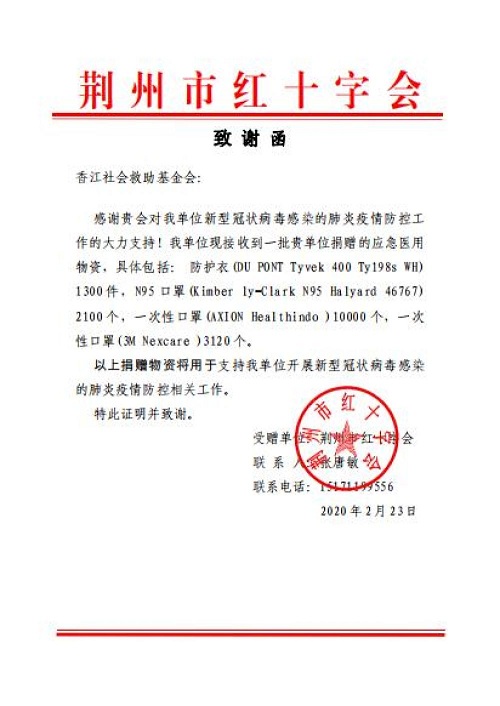 本次援助荊州抗疫醫(yī)療物資包括1300件醫(yī)用防護服、2100個N95口罩、3120個3M口罩、10000個一次性醫(yī)用口罩,該批物資也成為香江社會救助基金會抗疫期間捐贈的第四批醫(yī)療物資。