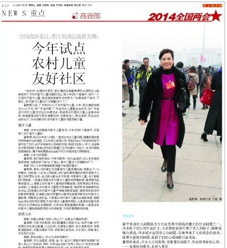 一如往年,全國政協(xié)委員、香江集團(tuán)總裁翟美卿在全國兩會上繼續(xù)保持了對農(nóng)村留守兒童問題的關(guān)注。她今年的5個提案中,其中一個還是關(guān)于留守兒童,她在接受南都專訪時表示,“如果政府不參與、不牽頭,(農(nóng)村留守兒童)這個問題解決不了。”