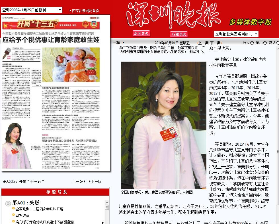 全國(guó)政協(xié)十二屆四次會(huì)議昨日開幕,在深的全國(guó)政協(xié)委員繼續(xù)發(fā)聲。昨日,深晚記者連線北京,專訪了全國(guó)政協(xié)委員、香江集團(tuán)總裁翟美卿。翟美卿本屆兩會(huì)提交了4份提案,連續(xù)4年呼吁關(guān)注留守兒童問題,呼吁政府為鄉(xiāng)村學(xué)前教育兜底。另外,為減輕二孩家庭養(yǎng)育負(fù)擔(dān),翟美卿還建議,給予生育家庭個(gè)稅優(yōu)惠。